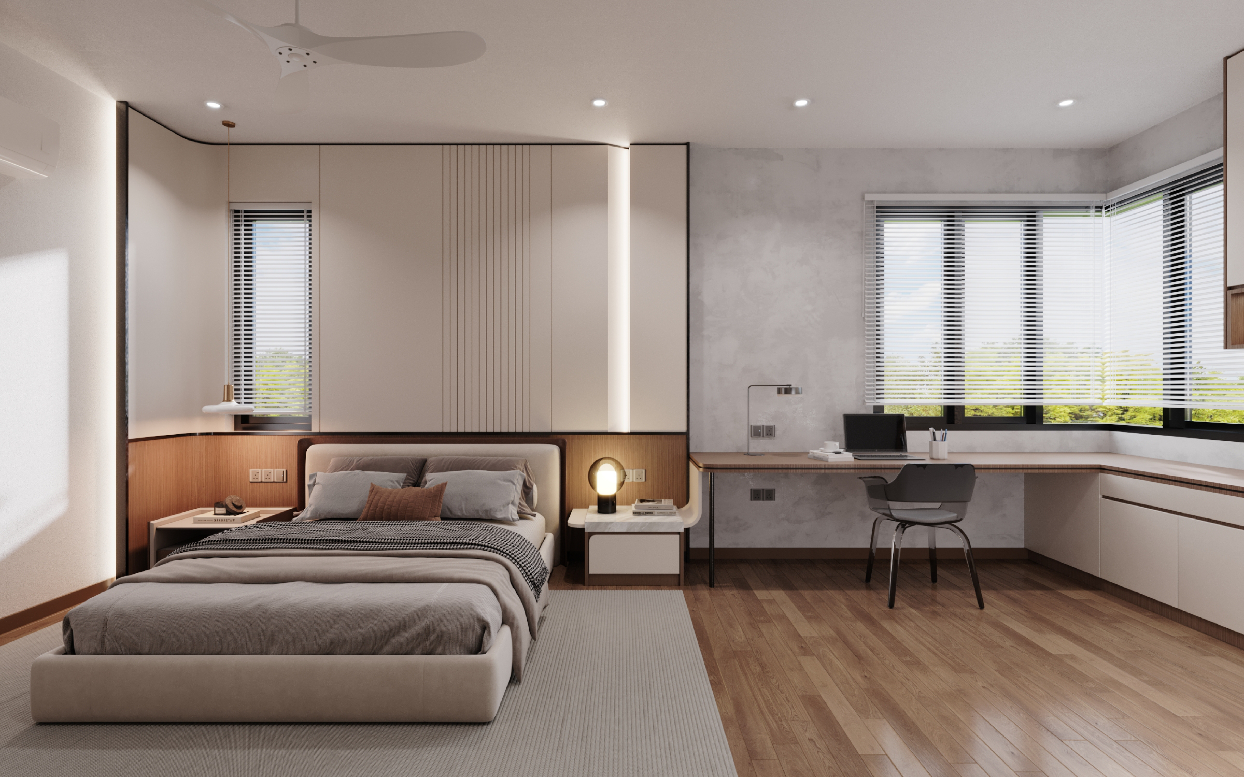 A serene master bedroom featuring custom millwork and luxurious finishes.